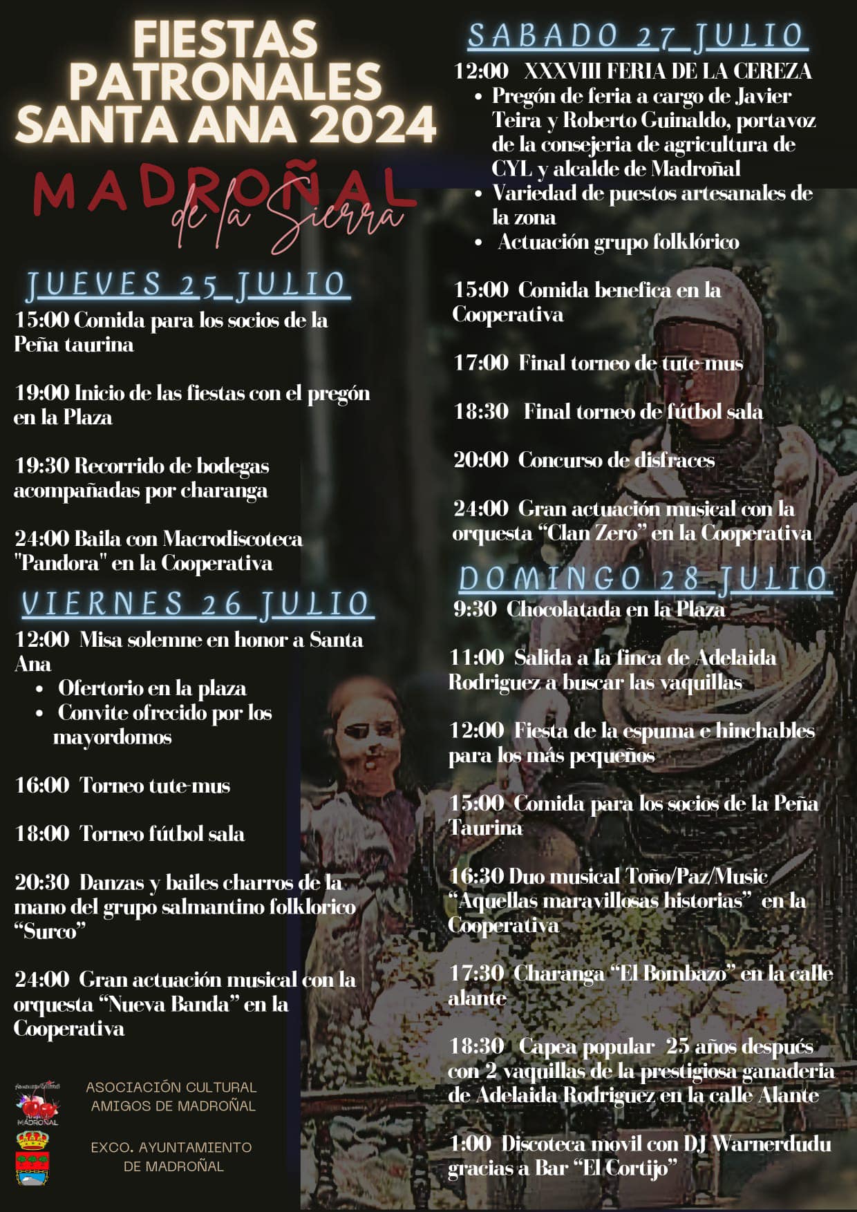 La patrona de Madroñal es Santa Ana, una de las ocho bellas vírgenes que rodean a la Peña de Francia, como dice el romance. Las fiestas son los días 25,26 y 27 de Julio ( Santiago, Santa Ana y Santanina, como dicen en el pueblo). Las festividades se celebran de manera conjunta, y el día 26 se lleva a cabo la misa y el ofertorio en honor a la Virgen. Además, se dedica un día especial para los niños, se disfrutan de las tradicionales verbenas, se realiza una ruta por las bodegas locales, se organizan torneos deportivos, y la celebración culmina con la popular Feria de la Cereza.